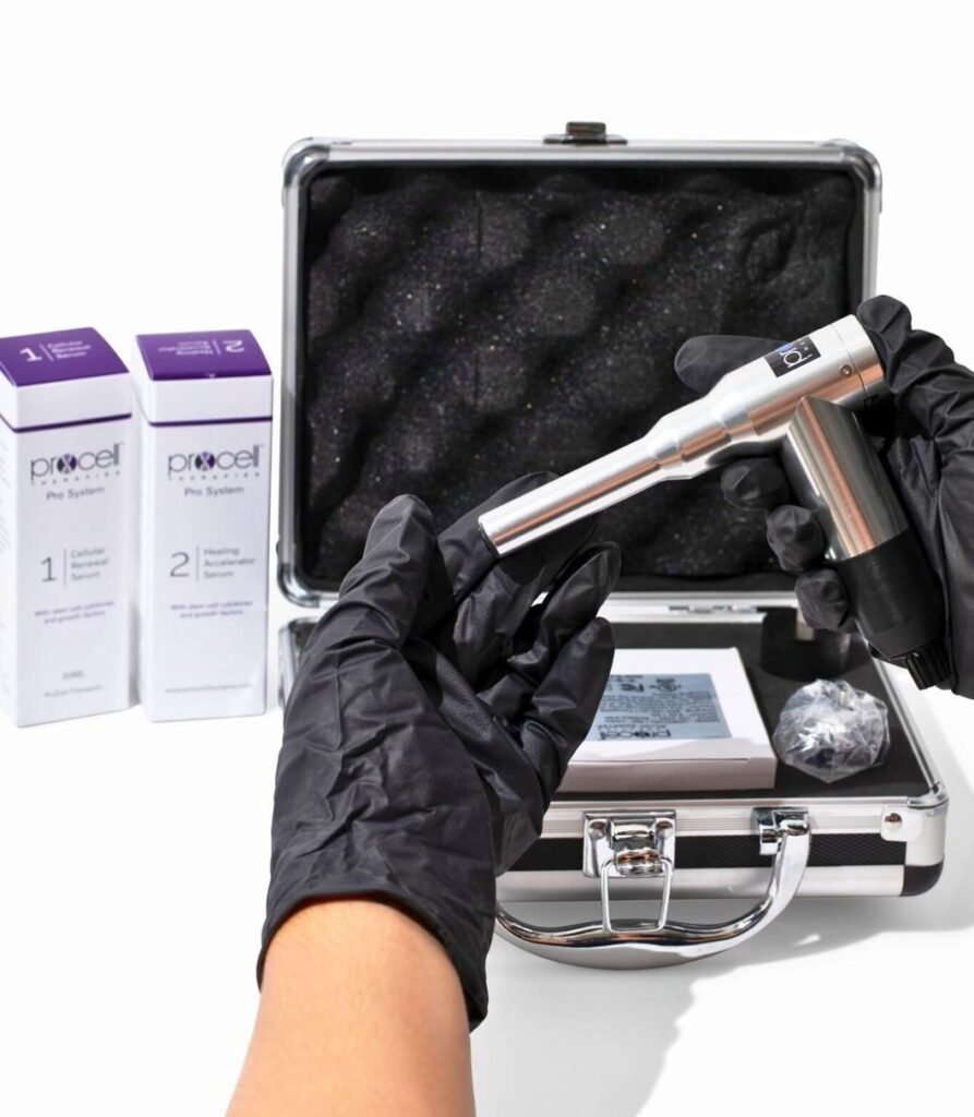 It is the next evolution of traditional microneedling. The Procell device creates precision micro-injuries in your skin, stimulating a natural immune system response and the increased production of collagen and elastin. Then, we introduce our Procell serum, rich in peptides, growth factors, and cytokines, into the channels, achieving next-level absorption and further supporting collagen production.